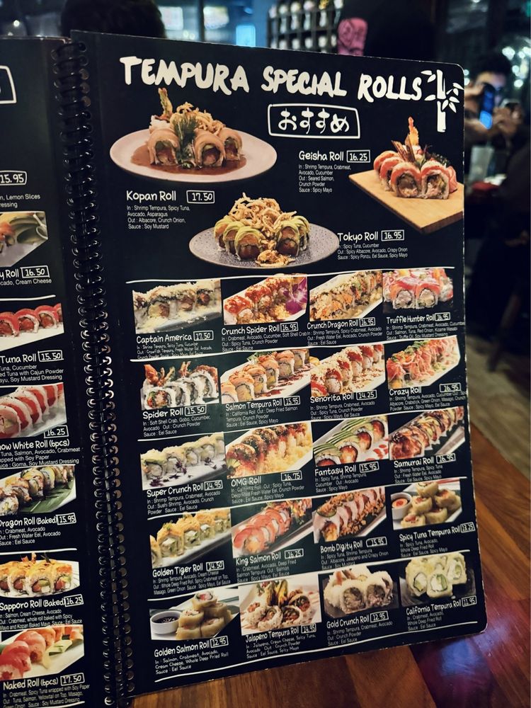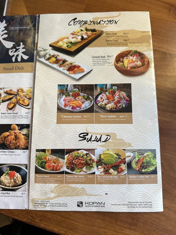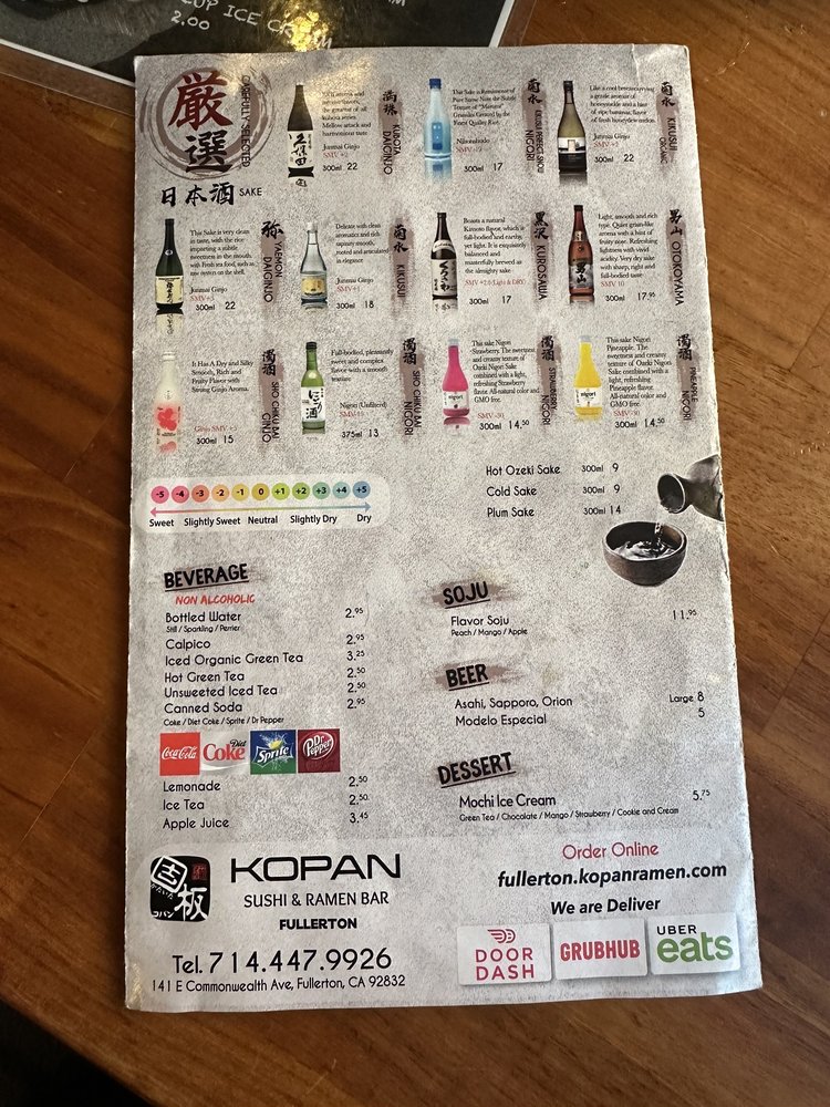 Kopan Sushi & Ramen in Fullerton, CA offers a diverse menu featuring ramen and sushi. Customers praise the fresh sushi rolls like salmon truffle with blue crab and yellowtail jalapeño. The ramen, like Kuro Mayu with black garlic oil, impresses with flavorful broth and perfectly cooked noodles. The ambiance is casual and trendy, with friendly service and gender-neutral restrooms. Bento boxes are a hit, and the happy hour specials are worth trying. The extensive menu and variety of options make this restaurant a favorite for many, with options for soy-free, vegan, and limited vegetarian diets. Overall, Kopan Sushi & Ramen is a solid choice for delicious Japanese cuisine, whether you're craving sushi, ramen, or a late-night bite.